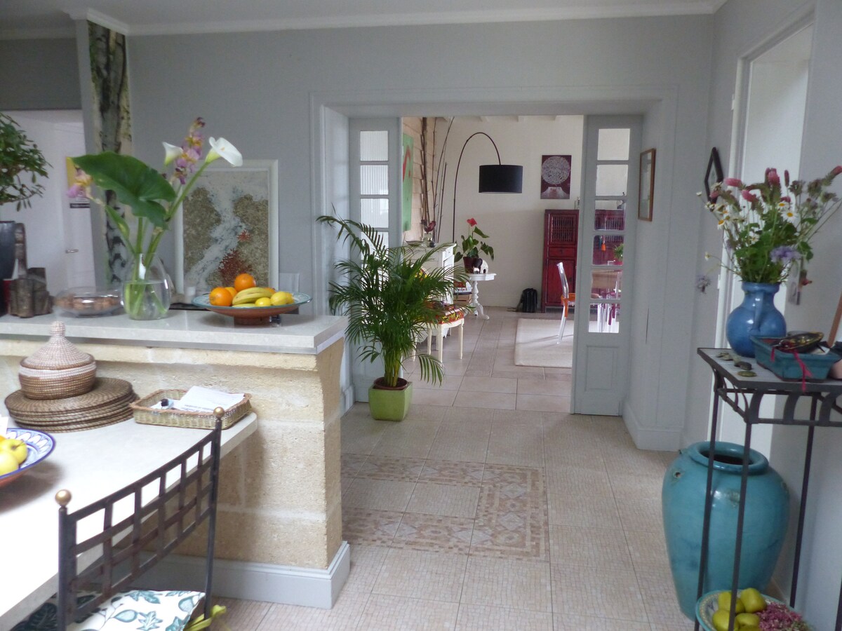 ¡Tranquilo! "Le Logis Bellevue" ha sido amueblado en nuestra casa típica de Saint-Emilionnaise con una entrada independiente por una escalera! una terraza privada con vistas panorámicas de la ciudad, los monumentos, el valle de la Dordoña, los castillos y los prestigiosos viñedos. A 15' de Libourne, 30' de Burdeos y 1h30' de la Costa Atlántica. A 2 pasos de comercios de proximidad, restaurantes, animaciones y estacionamientos públicos. Es adecuado para todo tipo de viajeros (turismo/negocios)