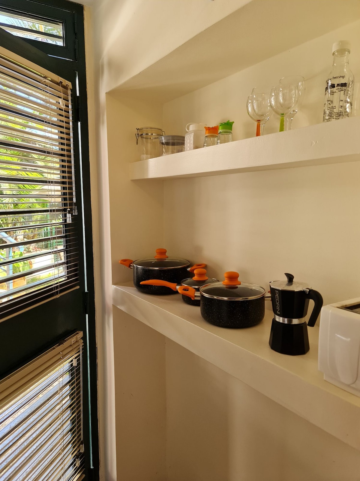 Ideal para familia o grupo, el espacio se divide en área social con cómoda cama matrimonial y baño y una habitación contigua independiente con cama Queen y baño privado con vestidor walk-in closet, y su aire acondicionado split. El apartamento tiene cocina de 4 hornillas, microondas, nevera completa. Escritorio con wi/fi. vista a lasmontañas desde la hab/y amplio jardín vistable abajo en área de otros anexos, con parrillera portátil de carbón.