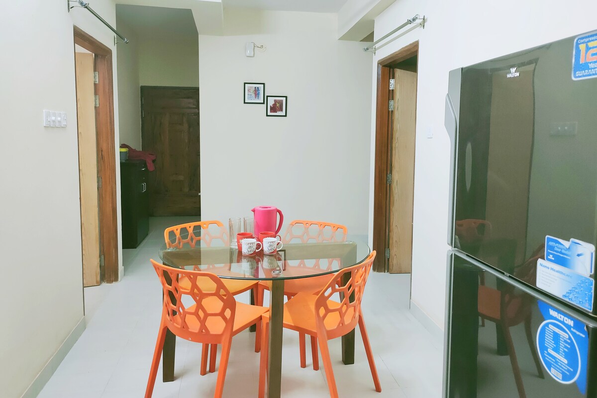 ¡Te damos la bienvenida a tu retiro sereno en el norte de Banani, Daca! A solo 5 minutos a pie del Hotel Sheraton, el supermercado Banani y Gulshan, nuestro departamento totalmente amueblado tiene capacidad para seis huéspedes. Disfruta de tres dormitorios acogedores, una cocina moderna, un comedor y una sala de estar relajante. Sal a tu balcón privado para tomar aire fresco o utiliza el mini espacio de trabajo para la productividad. También Gulshan y Baridhara están muy cerca de nuestro departamento. ¡Reserva tu estancia hoy mismo y disfruta de una escapada encantadora en Banani!