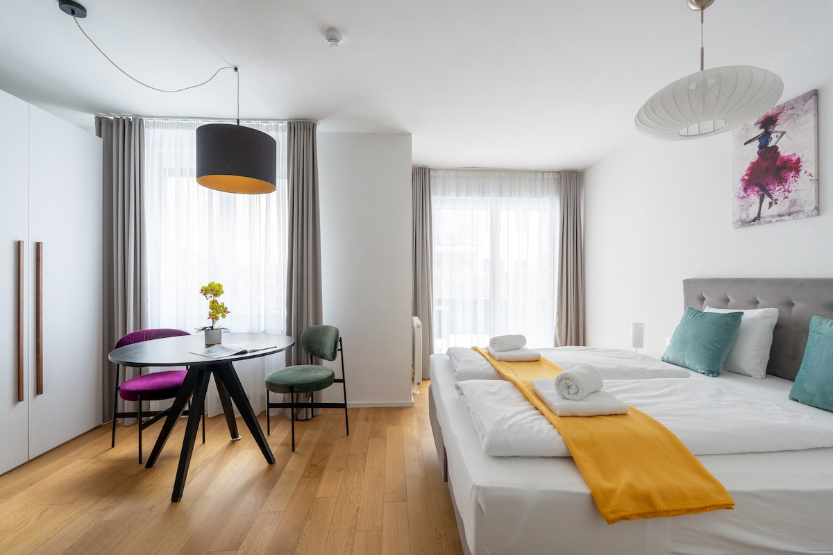 Welcome to our Urban 1BR Suite, located directly in front of the U1 metro station Altes Landgut. Stephansplatz and Vienna’s city center are just 10 minutes away by metro. Key Highlights: • Professionally managed property • Paid garage parking available on the premises • On-site amenities: luggage lockers, laundry room & lobby