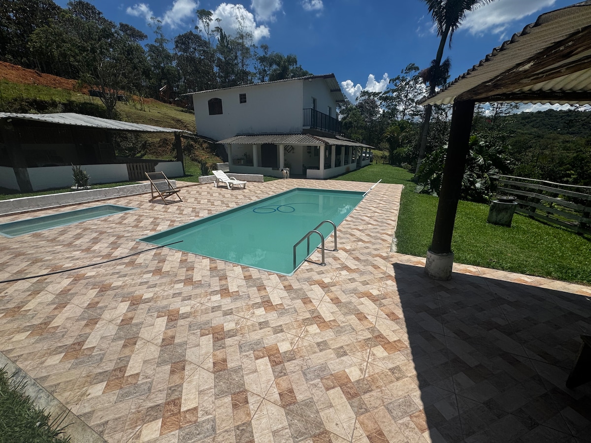 Casa com ampla sala, lareira, mesa de jogos (cartas, gamão, etc), 3 sofás-cama. Quatro quartos internos e uma pequena suíte externa. Quatro banheiros e cozinha! Área externa com churrasqueira, forno a lenha, pia, cooktop e geladeira duplex e freezer! Mesa de bilhar e pebolim! Linda piscina de 4 x 8 metros com 48.000 litros! - Recém reformada Dezembro 2022. Pequeno lindo lago, capela, árvores frutíferas, gado e cavalos!