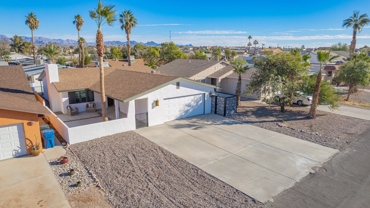 Relájate con toda la familia en este lugar tranquilo para hospedarte. Este alojamiento tiene una ubicación céntrica. A poca distancia a pie del acceso accesible al agua. Cerca de parques y casinos. Planta abierta con aire acondicionado central, capacidad para hasta 7 personas (máximo). Barbacoa de gas afuera en esos días calurosos. Máquina de HIELO industrial. Nuevo sistema de agua de niebla instalado en el patio trasero para refrescarse en esas hermosas noches en el desierto. Sistema de refuerzo de velocidad de malla wifi súper rápido.
