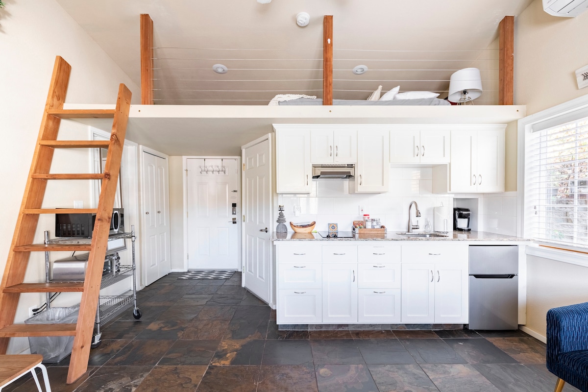 Tranquil & modern studio w/ loft located 90 min fm Yosemite, w/private garden patio & EV car charging stn, in a Foothill neighborhood. We’re sorry, but we cannot accept children. The space is a clean, quiet, studio w/ kitchen, queen sized bed, futon couch, bathroom with a rain shower head, & sleeping loft. It's stocked with luxurious throws, linens, and towels. We are a LGBT family. We speak Spanish & have traveled extensively & lived internationally. We welcome you to our peaceful retreat!