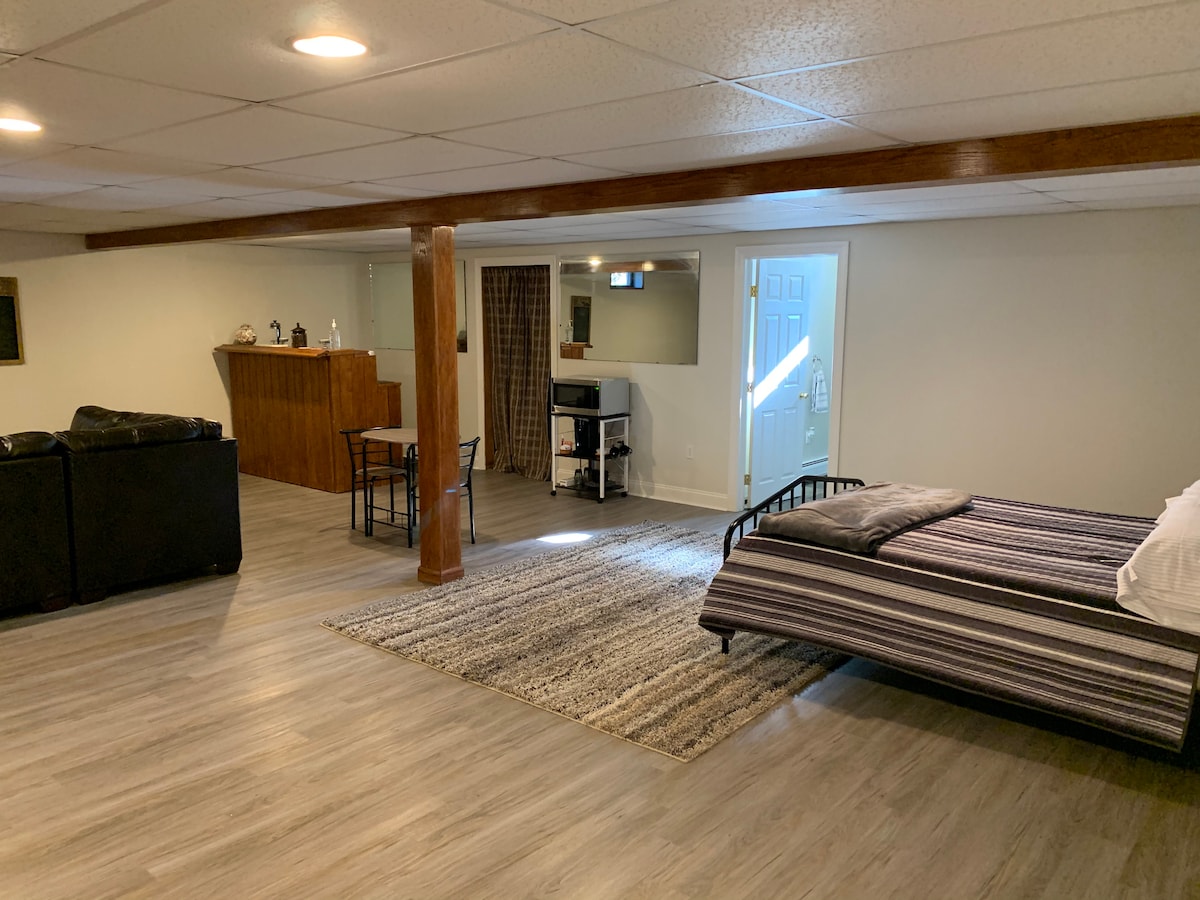 Espacio de sótano completamente remodelado. Situado a menos de 32 km de las estaciones de esquí de Shawnee, Camelback y Blue Mountain, parque Columcille Megalith. A poca distancia a pie del sendero Wind Gap del sendero de los Apalaches. Numerosas bodegas y zonas de senderismo cerca. Ubicado en el centro entre Stroudsburg y Easton, la Universidad de East Stroudsburg y la Universidad de Lafayette. A 5 minutos de la Ruta 33. Hay una zona de estar al aire libre para que la disfrutes. Wifi, aparcamiento fuera de la calle. Las ventanas sobre el suelo proporcionan luz natural.