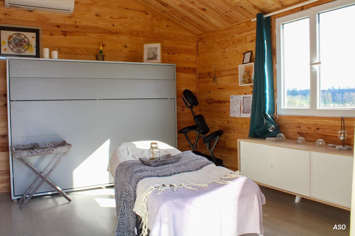 Pequeño estudio acogedor de madera estilo cabaña (o «tiny house»). Bien equipado,cómodo y a la vez sencillo, con su dormitorio en el altillo ( techo bajo ) . Podrá disfrutar de su pequeña terraza,las vistas a los Pirineos y las colinas del Gers. Estudio para dos personas sin hijos (debido a la escalera). Sin contaminación lumínica, alojamiento ideal para los amantes de la astronomía o simplemente para aquellos a los que les gusta mirar las estrellas ⭐️