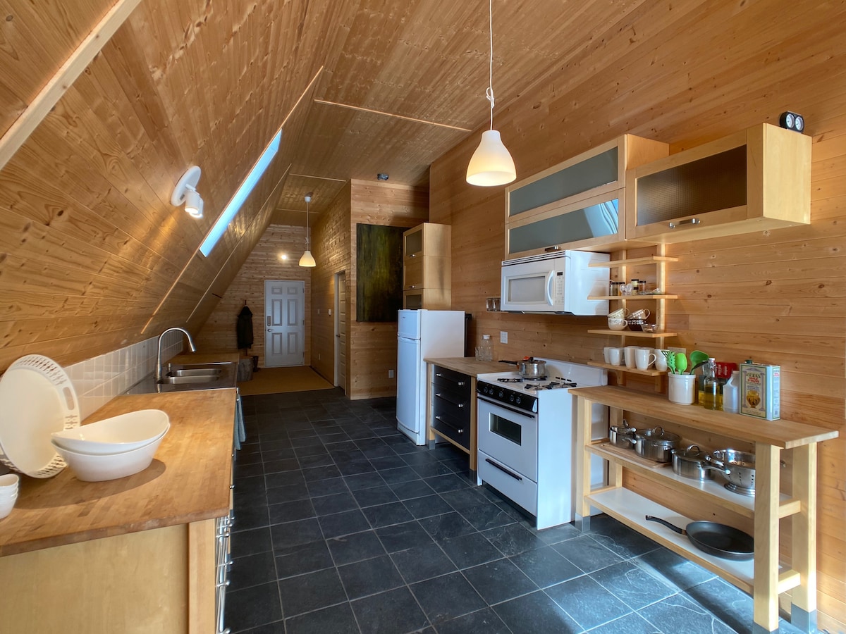 Welcome to La Khabine! This cozy, modern cabin comes with all you need to relax and connect with nature. Enjoy a glass of wine with the sound of a crackling fire in the wood burning fireplace. Take in the view of the forest through the surrounding floor to ceiling windows. Relax in the private outdoor cedar barrel sauna. Natural self-care products, firewood, laundry soap, and high-speed Wi-Fi are all complimentary. We hope you'll love our little cabin of windows as much as we do :)