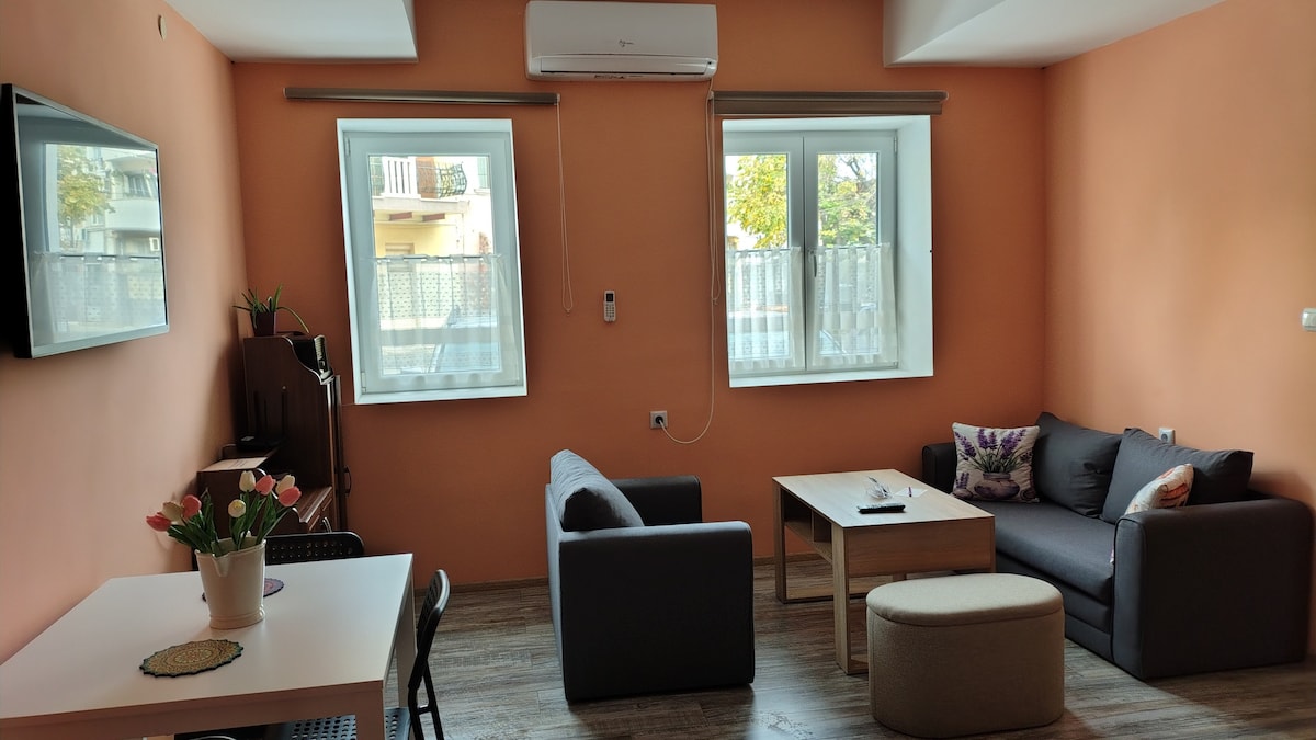 Дайте си почивка и се отпуснете в това спокойно и стилно място. Много уютен и чист апартамент, в който може да се насладите на чаша вино с хубава книга в ръка или пък да поиграете на някоя забавна, настолна игра. Апартаментът разполага със спалня и разтегателен кухненски диван. За тези, които трудно се събуждат без чаша горещо кафе, предлагаме кафе-машина с капсули и различни видове кафе. Жилището се намира в близост до спирка на градски транспорт.