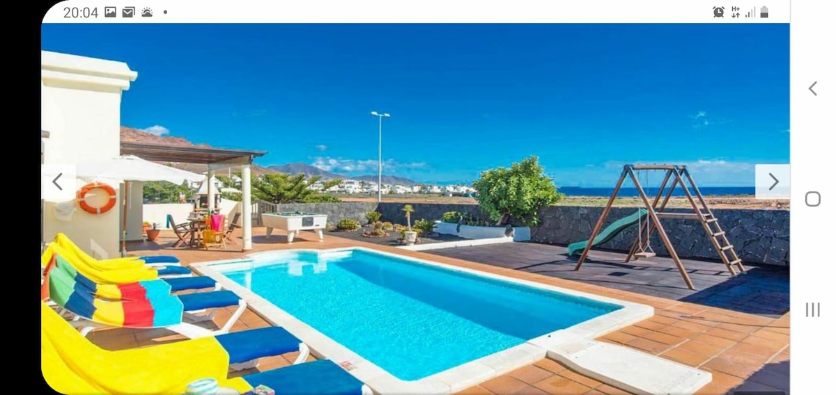 Lujosa villa con total intimidad. Situada en Playa Blanca, rodeada de muros de piedra volcanica y protegida del viento. Vistas al volcan. Mar a 1 kilometro. Piscina climatizada a 28° C y con exposicion Sur. Jacuzzi (36°C). Barbacoa grande Jardin tropical muy lindo. Ducha exterior, terraza cubierta, salon de jardin y tumbonas. Entrada, gran salon, comedor, cocina, 1 habitacion de matrimonio con baño, 1 habitacion con 2 camas y un segundo baño . Parking privado. Smart TV. Wi-Fi 50 Mbps