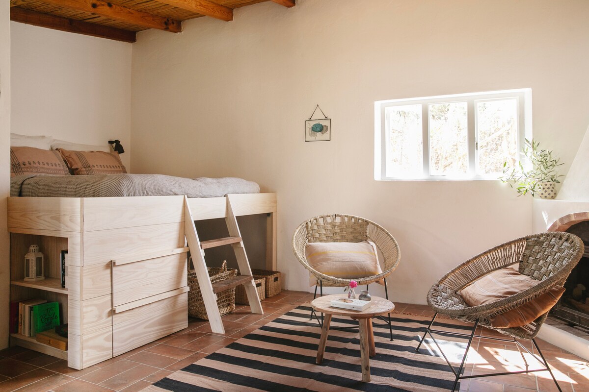 Estudio de espacio abierto con entrada independiente integrado en una casa de arquitectura contemporánea, donde vivimos, junto a las ruinas de un antiguo molino. Fantástica vista al campo. Cama para 2 personas, con la posibilidad de alojar a otra en un sofá adicional (pago adicional de 20 euros). Cocina totalmente equipada. Magnífico baño. No hay calefacción central ni aire acondicionado, pero se proporcionan calentador y ventilador. La casa está a 25 minutos de las playas de Comporta, Melides, Sines, etc. Internet de fibra.