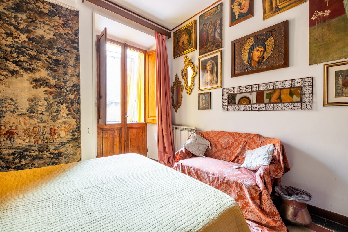 Apartamento único situado en la planta principal del Palazzo Alibrandi (siglo XVI), en una plaza tranquila junto a Campo dei Fiori. Tras pasar por el hermoso patio interior y la escalera, todavía parcialmente pintada al fresco, se llega a un balcón, decorado con una prestigiosa vidriera Art Déco, desde el que se accede directamente al apartamento. La suite, recientemente renovada, tiene techos artesonados de 6 metros y muebles de gran valor. A partir de agosto de 2024, aire acondicionado nuevo. Limpieza 50 € a pagar a la llegada