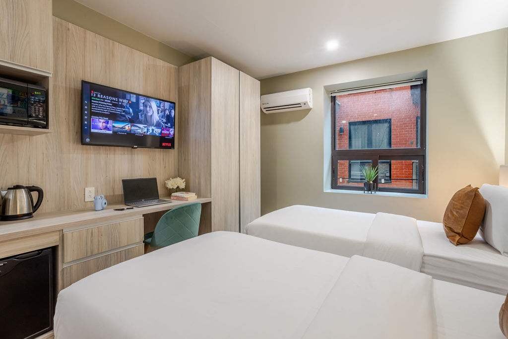Esta elegante habitación de hotel combina estilo y comodidad, con dos lujosas camas individuales con sábanas de primera calidad, ideales para amigos o viajeros solitarios que comparten un espacio. Situado en uno de los barrios más animados de Montreal, estás a pocos pasos de cafeterías, bares y joyas culturales. Los huéspedes también disfrutan de acceso a un acogedor salón en el vestíbulo y a un amplio sótano con cómodos asientos, una mesa de billar y un televisor de pantalla grande, perfecto para trabajar o relajarse.