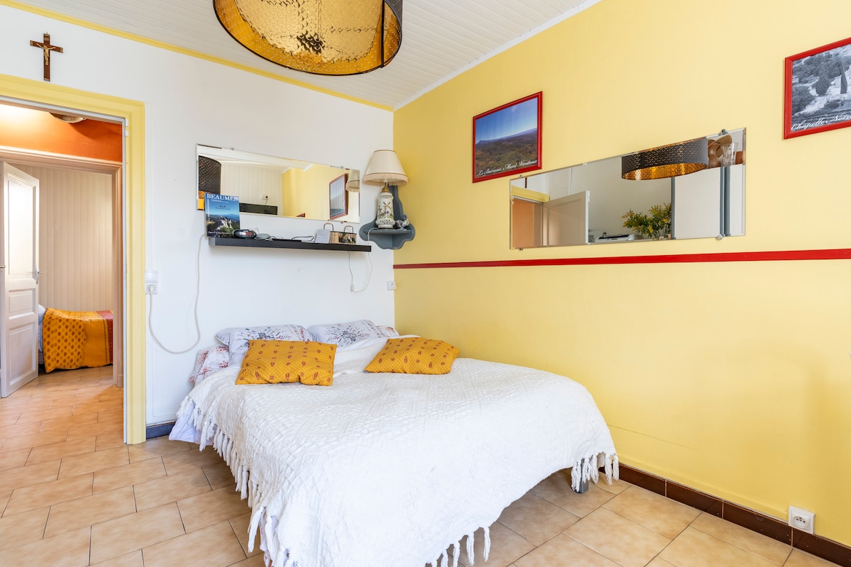 Entorno excepcional, tranquilidad y vistas Ventoux desde la propiedad. Nuestra "Villa Garrigue" está situada en una colina orientada al sur y frente al Ventoux, en el corazón de un pinar. A 15 minutos a pie del pueblo y sus numerosos restaurantes. Acceso a los GR desde la casa.Usted será privilegiado porque solo alquilamos una habitación (cama de 160 cm de calidad superior) No prevista para niños o BB. Acceso a la piscina de 9:00 a 19:00 sin calefacción abierta de mayo a octubre dependiendo del clima. Check in 17:00/19:00 con cita previa
