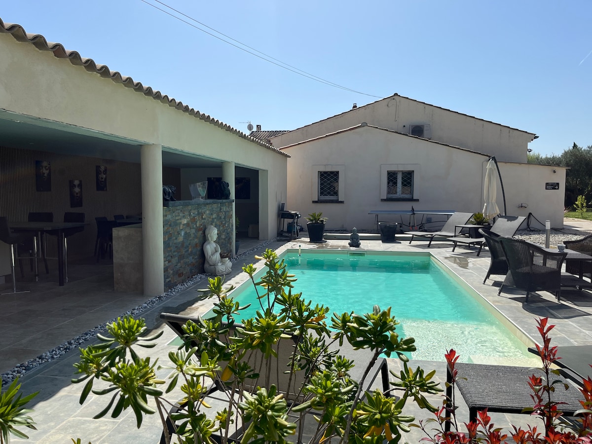 En un entorno verde, villa típica provenzal completamente renovada y decorada con cuidado. Tiene una sala de estar muy grande con zona de estar con billar y comedor, 2 dormitorios con armario empotrado, 1 baño con ducha y lavabos dobles, secador de pelo. 1 cocina totalmente equipada (horno, placa, microondas, lavavajillas, lavadora, hervidor de agua, cafetera). Pérgola,plancha, jardín, piscina, bicicletas, mesa de ping pong ... Estacionamientos gratuitos y seguros