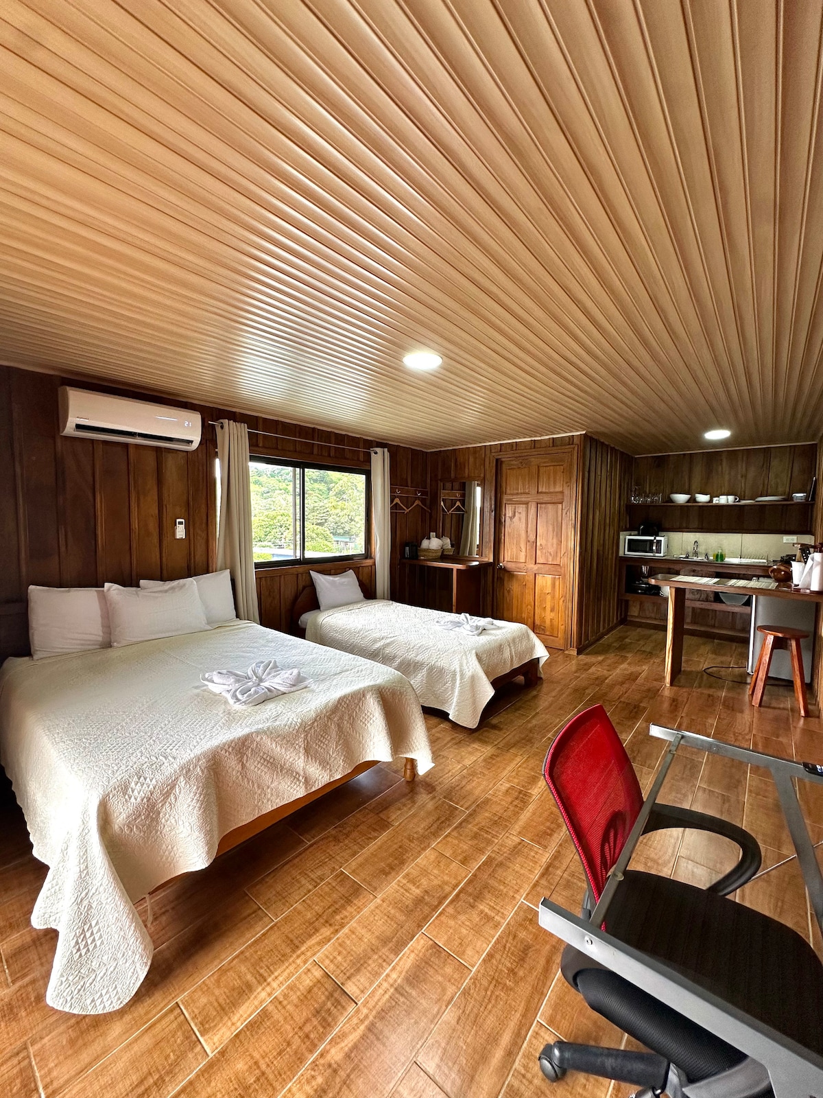 Cabaña Cloud Forest está en un segundo nivel y ofrece una vista abierta hacia las montañas. Los ventanales llenan el espacio de luz y resaltan los detalles en madera que crean un ambiente tranquilo. Cuenta con una cama queen y una cama individual, pantalla de 55”, aire acondicionado, calefacción y una cocina equipada. El balcón privado, con su mesita exterior, es perfecto para relajarse y disfrutar del clima fresco. Un espacio práctico, bonito y rodeado de naturaleza.