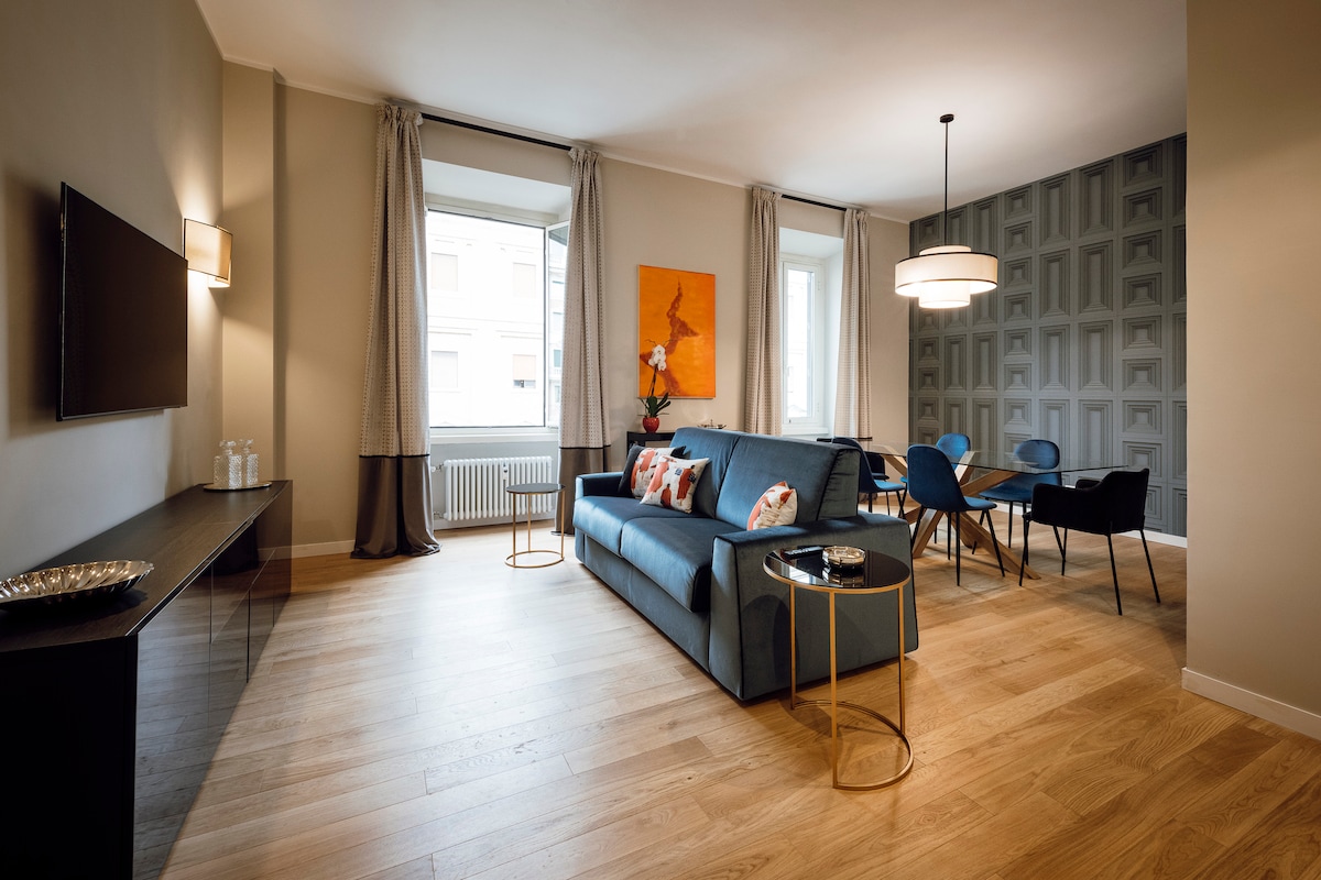 Está ubicado en el segundo piso de un antiguo edificio del siglo XVIII a tiro de piedra del Coliseo. Amplio y luminoso, desde la ventana se puede admirar el Fori Imperiali. El apartamento de 55 metros cuadrados tiene capacidad para 4 personas, consta de hall de entrada, amplio salón con cocina equipada con toda la vajilla necesaria y sofá cama doble, dormitorio doble, amplio baño y un balcón de servicio para fumadores. Completamente renovado con un estilo refinado.