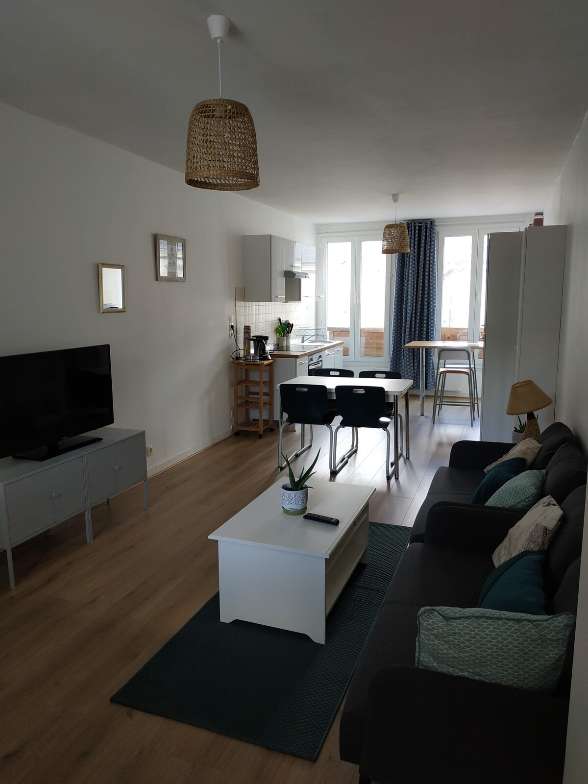 Maison de centre ville de plain pied de 50m2 avec entrée privée. Une grande pièce de vie avec cuisine ouverte et entièrement équipée (frigo, micro ondes, cafetière, bouilloire, plaque induction, grille pain, plancha), canapé lit 2 places ( 140) ou 2 lits d'appoint (90x190), espace TV et salon. 1 chambre avec un lit double (140) Salle d'eau, WC privé séparé Parking privé Espace extérieur avec salon de jardin Draps ,couettes ,oreillers ...sont fournis. Prévoir votre nécessaire de toilette.