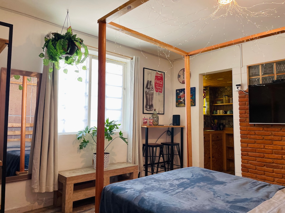 Departamento con dos espacios principales. En uno tienes una cocina amplia con comedor, y en el otro espacio tienes una recamara con cama tamaño king, televisión, wifi y baño. El departamento esta ubicado en el corazón de la roma Condesa enfrente de la plaza luis cabrera arriba del café toscano donde podrás disfrutar de un gran desayuno todos los días.