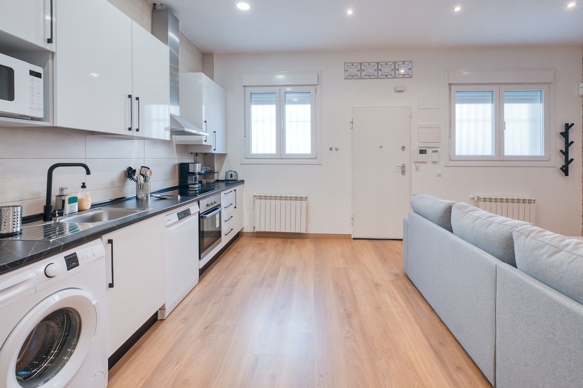Apartamento a pie de calle.ideal para viajes de trabajo, de estudios,asuntos médicos etc. con vitrocerámica, nevera, lavadora/secadora,lavaplatos, bomba de aire calor/frió, microondas, nespresso, utensilios de cocina completo,hervidor de agua para infusiones,cama matrimonio, sofá cama 190x150, smart tv, wifi, alarma, línea directa metro a Sol ( 15”),amplio baño, ducha efecto lluvia,dispensadores automáticos de gel.zona ajardinada,muy fácil aparcamiento, con dos parques infantiles de columpios