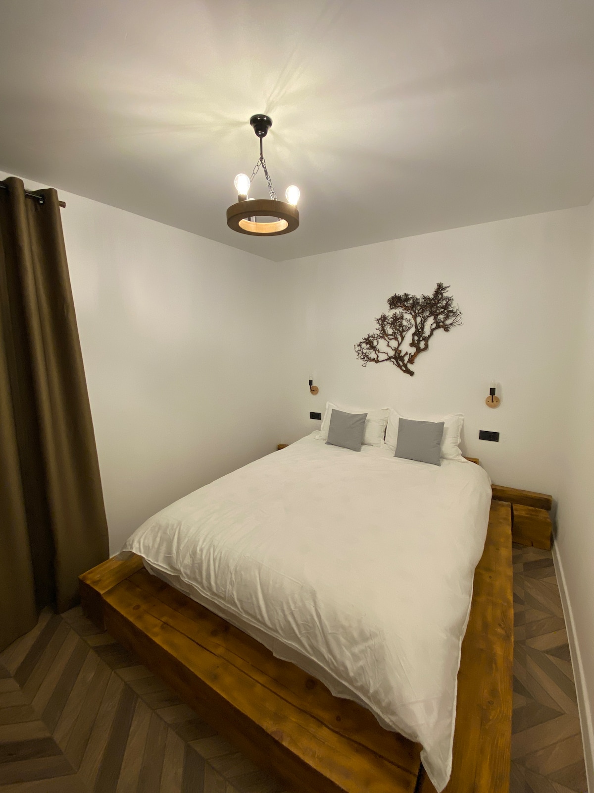 Vă punem la dispoziție o cabană complet utilată și atent amenajată, perfectă pentru un sejur liniștit 2 camere spațioase, fiecare cu baie proprie și pat matrimonial confortabil. Unul dintre dormitoare include și o canapea extensibila Cadă freestanding Living generos cu canapea extensibila Bucătărie complet utilată Șemineu Jacuzzi Videoproiector Foișor dotat cu grătar și rotisor Zonă de relaxare cu pat suspendat, șezlonguri Fire Pit Capacitate: 4–8 persoane