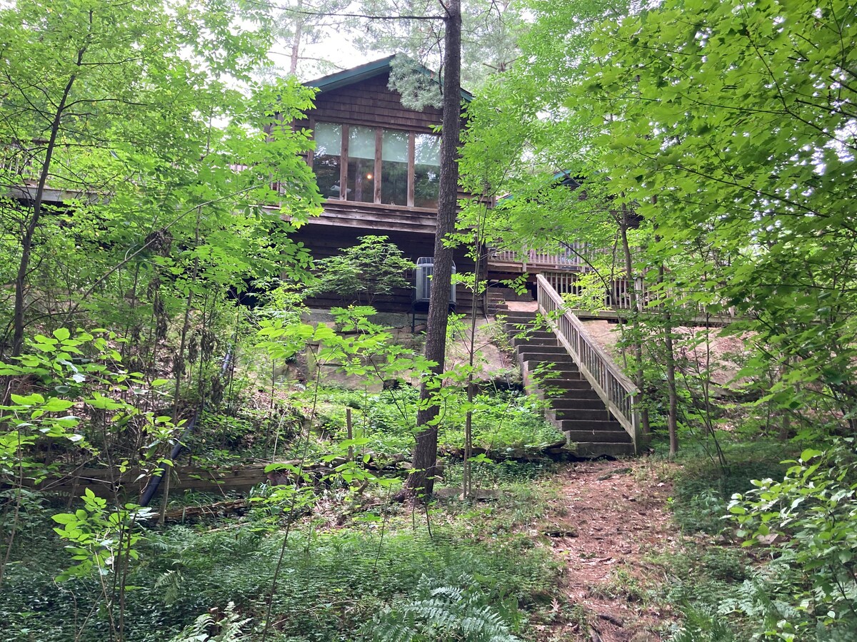 Esta pequeña casa de campo de lujo de 2 dormitorios con loft es perfecta para una escapada romántica en pareja o en familia. Ubicada en 1,5 acres entre majestuosos árboles y afloramientos de granito, crea hermosas vistas desde la terraza con barbacoa, chimenea, jacuzzi o enormes ventanales en toda la casa. La presa de agua y el río al otro lado de la carretera crean relajantes sonidos de cascada que se escuchan desde la cubierta o se disfrutan de cerca desde la cubierta y el muelle privados de la costa. Explora el río Muskoka en kayak, surf de remo o neumáticos de río.
