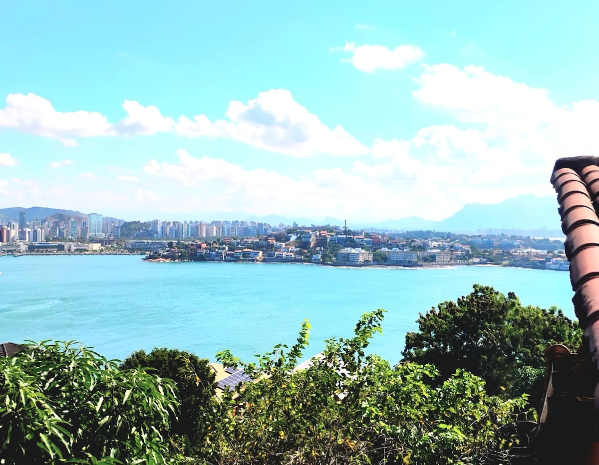 Casa aconchegante, de acomodação única, elaborada para desfrutar de bons momentos de lazer com a família e relaxar com vista para o mar! Localizada no morro do moreno, área de preservação ambiental, onde encontra tranquilidade, segurança, harmonia com a natureza e passeio em trilha ecológica que vai até o topo do morro com vista deslumbrante da bahia de Vitória e Vila Velha. Ficamos a 30metros da enseada praia do bananal e a 800 metros da Praia da Costa, a melhor praia do E.S.