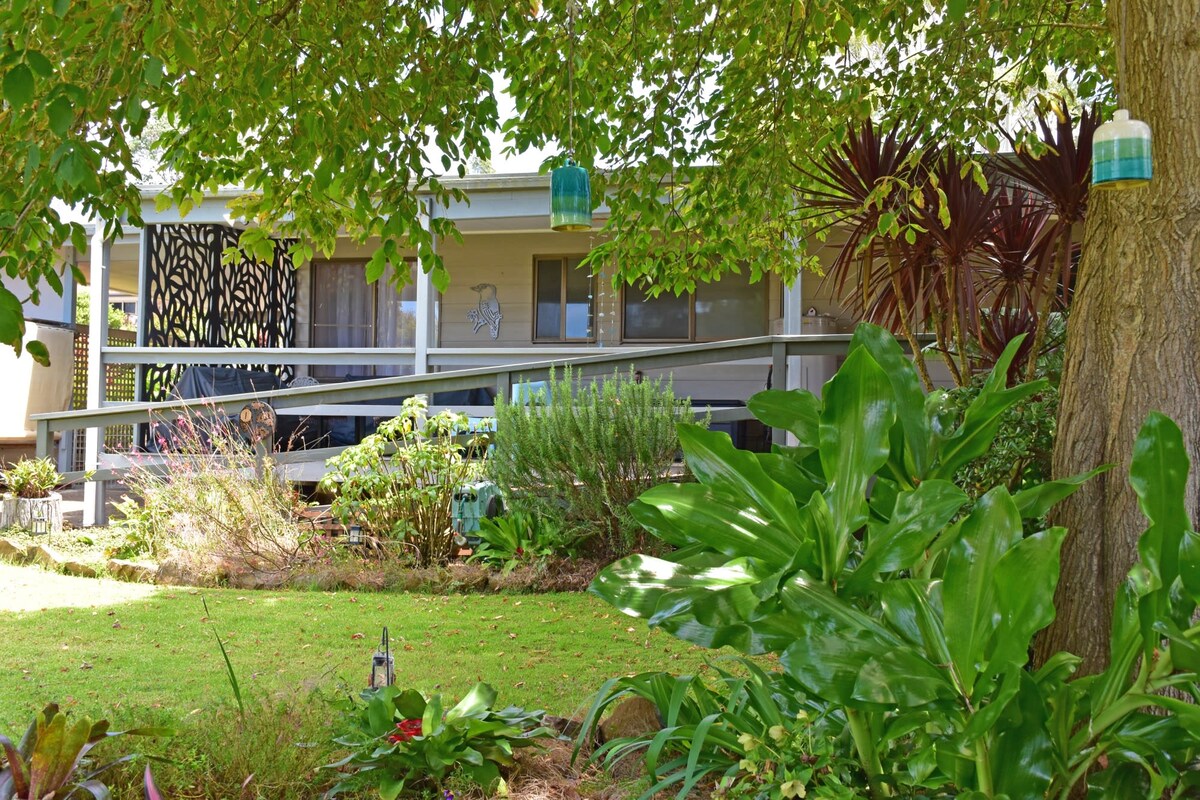 Nuestra cómoda y bien equipada unidad autónoma está situada debajo de nuestra casa familiar. Se encuentra a 1 km de la playa y el río, y a 6 km de la ciudad rural de Moruya, en la costa sur de Nueva Gales del Sur. Natación, pesca, kayak, mercados, paseos por la selva, senderos para bicicletas o relajarse. Todo está aquí para ti y tu familia. A tu mascota también le damos la bienvenida. Tenemos una gran zona de césped vallada con un cable de 1,6 m de altura donde tu perro puede correr, y nuestra playa local es un parque infantil para perros sin correa las 24 horas.