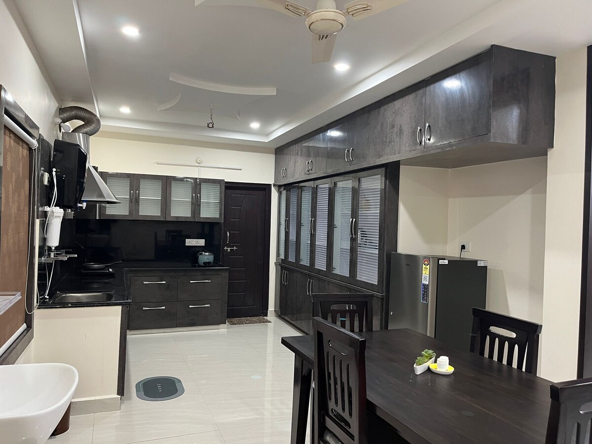 Welcome to your perfect spacious & peaceful 1 BHK Flat on 2nd floor to accommodate 3 guests. NOTE: There is NO LIFT This modern house offers a comfortable and stylish stay in the heart of the city Hyderabad. Enjoy the spacious kitchen and dining area. This home is designed for comfort and convenience with easy access to city. Book your stay today for a relaxing experience! Key Features: 1 bedroom & bathroom, kitchen & dining, Living Room with Sofa Bed, Smart TV, Wifi, CCTV, front Patio