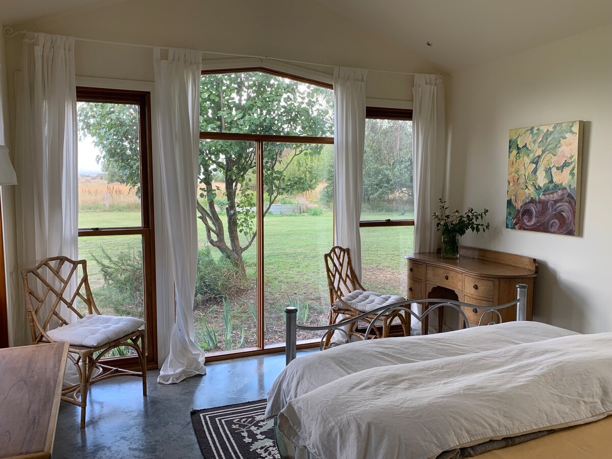 Disfruta de un retiro de arte, escritura o yoga, trabaja desde casa o una boda. Propiedad aprobada por el National Trust, muy privada, amplias vistas rurales, a 10 minutos caminando de cafés y galerías patrimoniales. Fácil acceso. Sin escalones. Ropa de cama de lino francés, piso de baño climatizado, fuego de leña🔥, esterillas de yoga, calcetines merino, wifi, una pequeña biblioteca 📚 Cama tamaño queen y sofá cama. Se proporciona pan de café fresco, huevos, queso, fruta y despensa, expreso De Longhi, microondas, mini horno. Granja Mona 5 min, Canberra 1 h, Costa Sur 40 min, campos de esquí