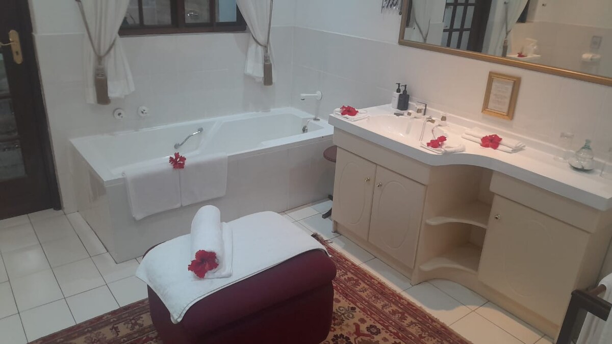 Disfruta del glamour de este refugio elegante y exclusivo. Una moderna y lujosa suite con ducha, vestidor y tocador. A solo 15 minutos en coche del aeropuerto O R Tambo, puedes encontrarte en el borde del lago Swan. Puedes levantar los pies y disfrutar de los serenos alrededores del lago. La observación de aves es imprescindible, pavos reales haciendo alarde y patos nadando a tu lado. Un lugar donde puedes dejar ir el estrés de la ciudad. Pero lo suficientemente cerca como para seguir formando parte del ajetreo.