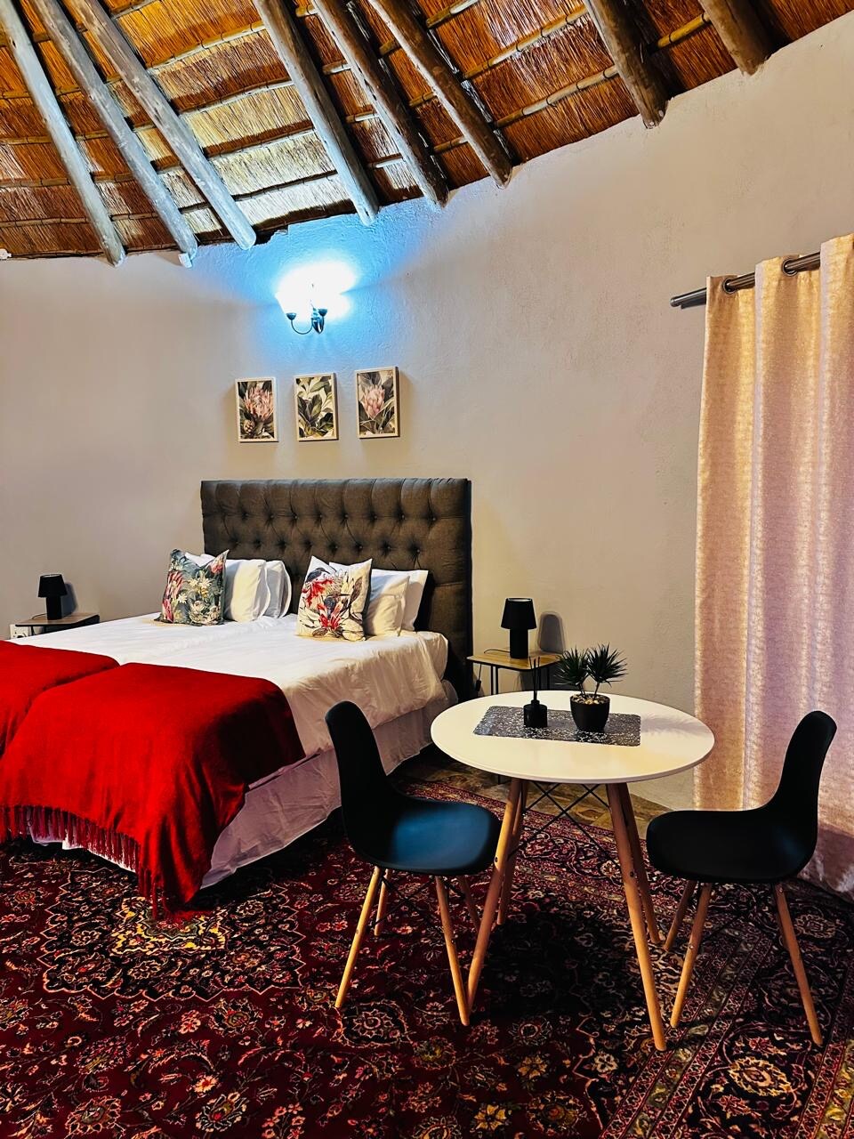 Chalet de planta abierta de troncos con techo de paja, unidad de autoservicio con terraza privada y servicio de braai. Relájate en tu terraza y disfruta de una vista increíble sobre el valle de De Kaap. Instalaciones de spa disponibles para los huéspedes.