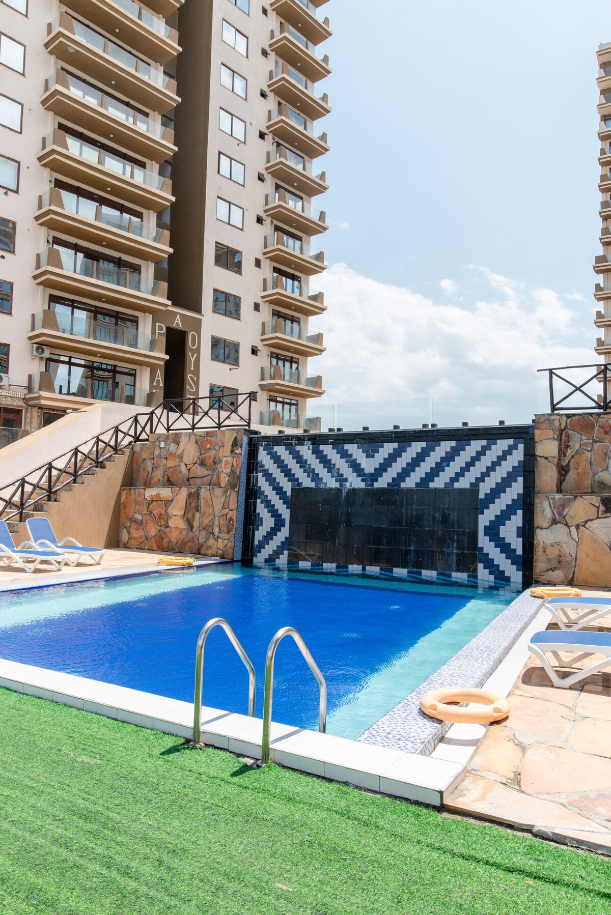 Acogedor apartamento estudio con servicios (Bamburi) amueblado. * Adecuado para 2 adultos y 1 niño o 3 adultos, amueblado con una cama tamaño queen y una cama individual. * Incluye aseo diario. * Mesa de comedor con cuatro sillas, sofá, mesa de centro. * Aire acondicionado *TV * Caja fuerte con llave * Balcón con dos sillas y mesa de centro * Cocina: nevera, microondas, hervidor de agua, cafetera, tostadora, vajilla y cubiertos. * Acceso a servicios: piscina, zona de juegos para niños, bar de playa, restaurante, gimnasio, playa, lavandería. * A 21 km del aeropuerto internacional de Moi. * A 26 km de SGR Mombasa.