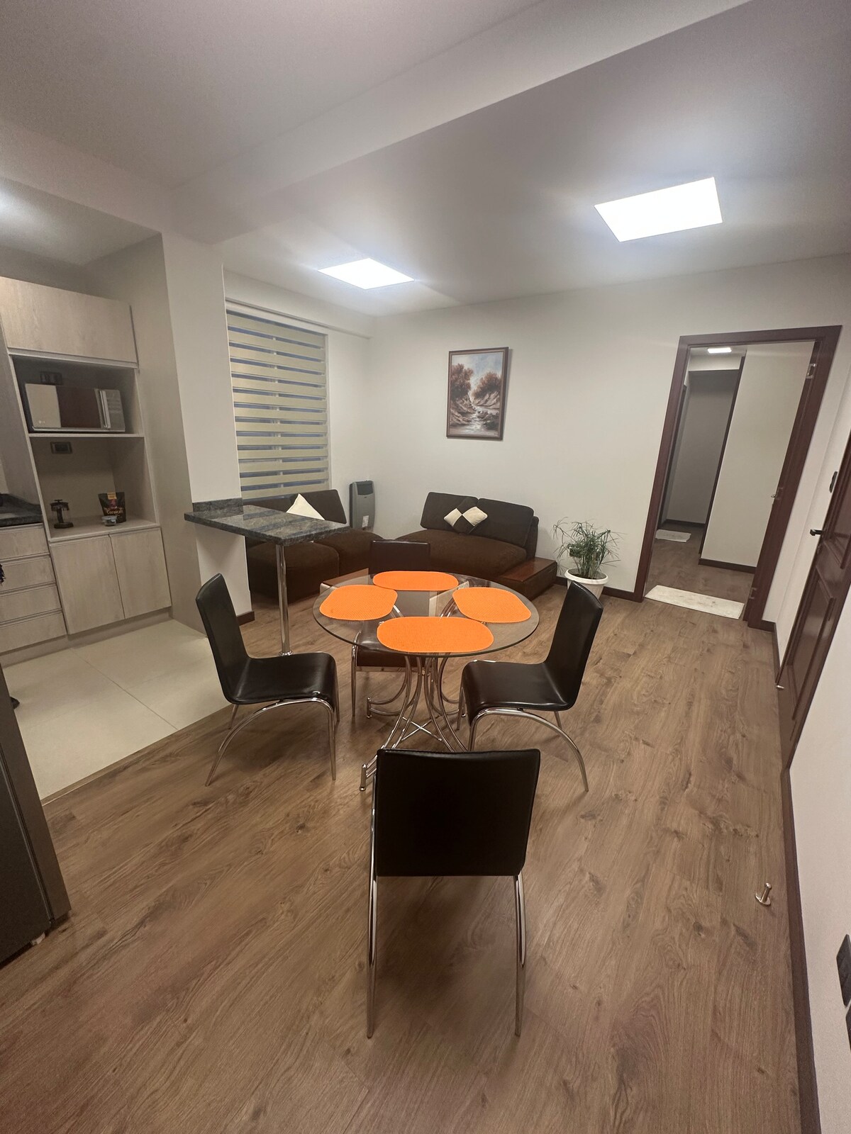 El departamento es encantador! La habitación cuenta con material de línea hotelera para un descanso confortable, la cocina y sala cuentan con todas las comodidades necesarias. La iluminación es perfecta! El departamento se encuentra en una zona completamente segura y centrica, a pasos de supermercados, embajadas, hospitales, bancos, cine, estaciones de teleférico, cafeterías, centros comerciales, bares de rock, discotecas, etc.