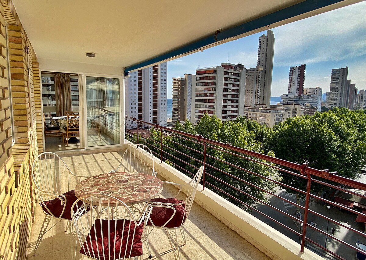 Apartamento de 2 habitaciones para 4 personas en primera línea de la playa Poniente, con vistas de la playa y el mar, terraza grande con vistas, todo exterior, salon amplio con vistas al mar, aparcamiento privado, wifi, TV, aire acondicionado, cocina completa (lavavajillas, lavadora, horno), baño completo, en urbanización con piscina, jardín muy bonito con vistas al mar y pista de tenis. La urbanización tiene acceso directo al paseo maritimo y es una de las más bonitas de la playa de Poniente.