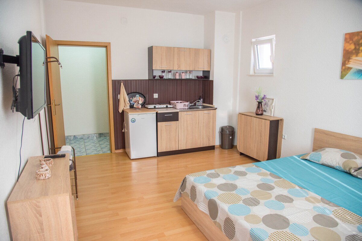 Apartamento de dos habitaciones para 2 personas, a solo dos minutos del centro de la ciudad. El apartamento está equipado con una cama doble, cocina, televisión por cable, wifi gratuito, toallas y baño privado. Ofrecemos aparcamiento en la calle junto al apartamento en la parte antigua de la ciudad. Todo lo que tienes que visitar en Ohrid, monumentos históricos, iglesias... está a varios metros de ti, el aeropuerto está a 10 km y la estación de autobuses está a 5 km de nosotros. Te ayudaremos a responder a todas tus preguntas si lo necesitas.