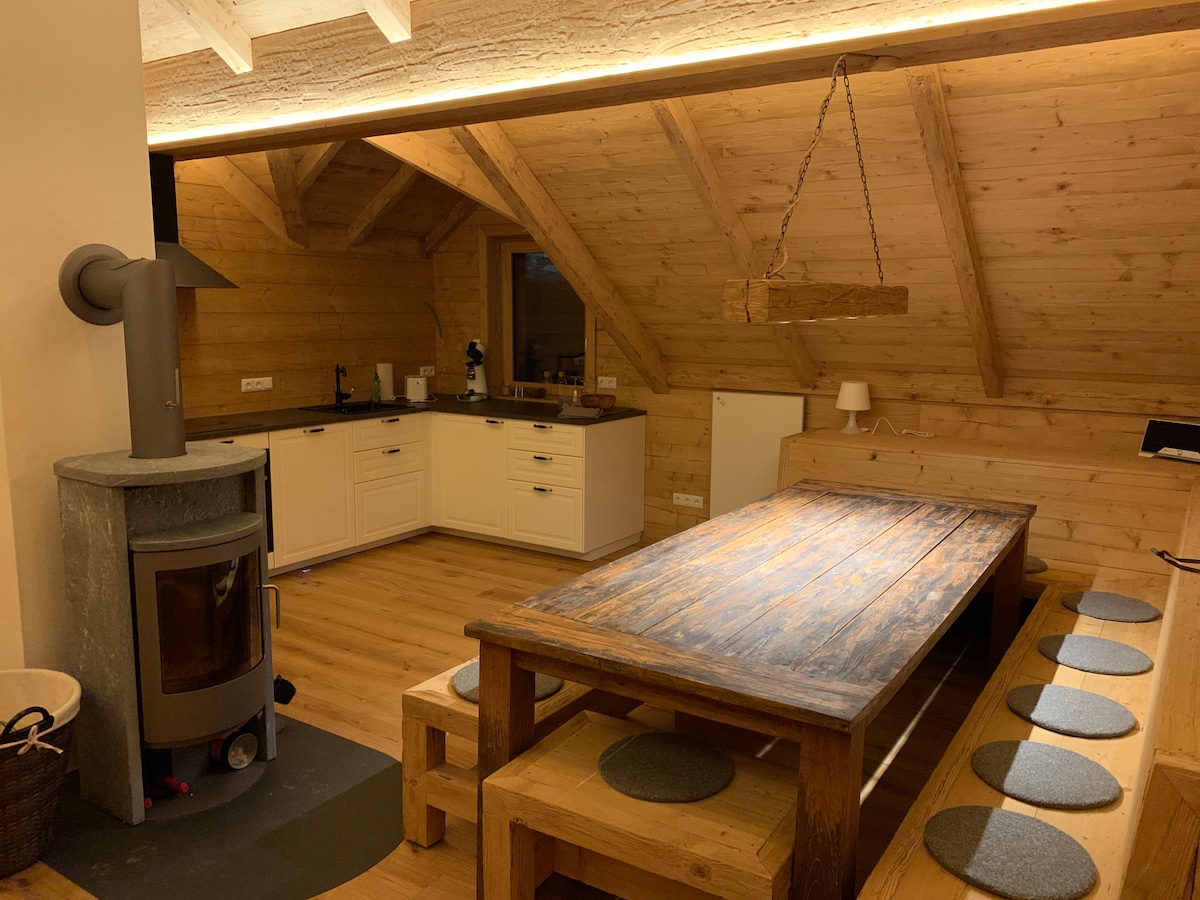 🔥 Sauna privada de pino piñonero exclusiva para nuestros huéspedes Chalet independiente de 140 m² en una ubicación absolutamente tranquila a 1,050 m, justo en el límite del bosque y junto a un arroyo de montaña con aguas cristalinas. La chimenea, la calefacción por suelo radiante y la cocina de alta calidad ofrecen comodidad. Senderos para caminar justo afuera de la puerta, lago de montaña y estación de esquí a solo 5 minutos.