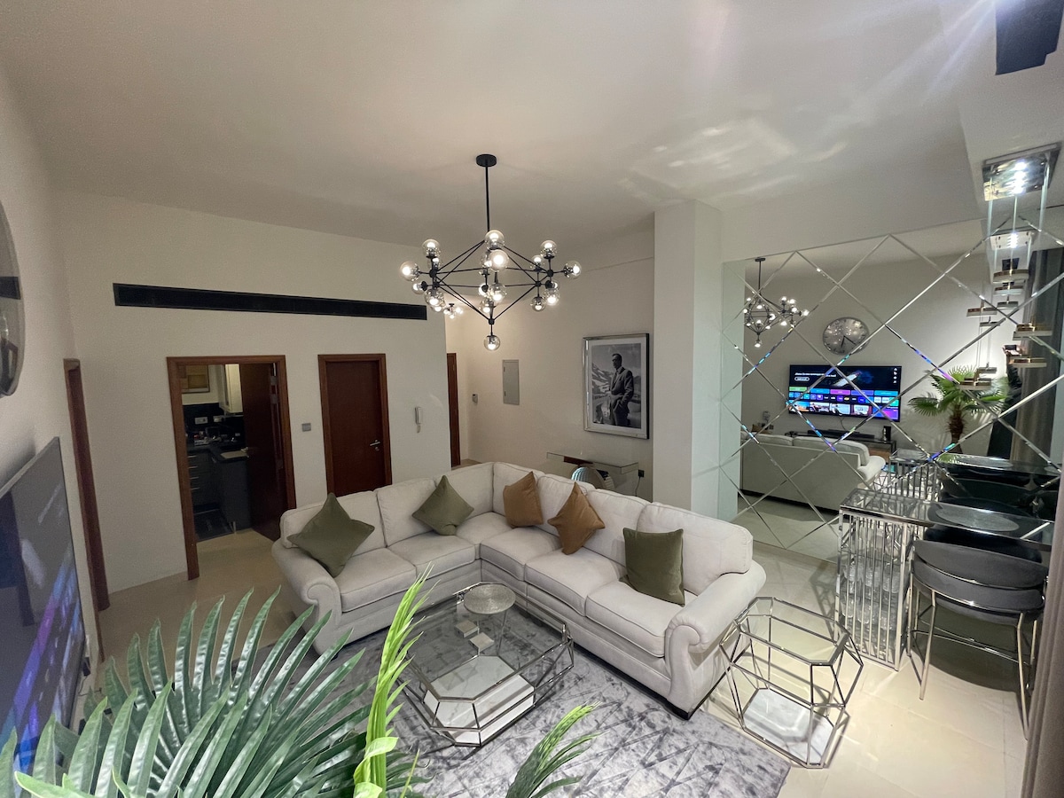 New 1 Bd flat with balcony, living area & 2 toilets.Nice furniture. Equipped with high speed WiFi, bed and dressing,sofa, 50 inch smart TV, satellite and free Netflix access, iron machine, hair dryer,vacuum cleaner, duct AC, ceiling with LED spot lights . You can enjoy the free swimming pool, gym & kids playground and BBQ cooking area. 5min drive from shopping malls, 15-20min from airport. 20min drive from beach, 20min drive from the old Market, next to sand dunes view.