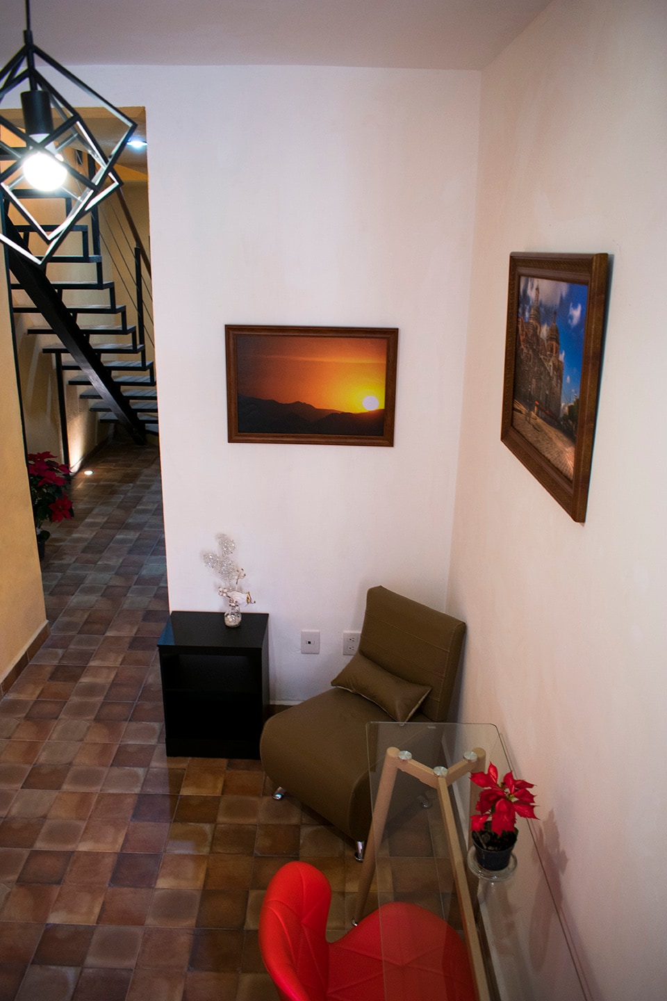 Casa Dos Cuervos en el centro de Querétaro. Disfruta de una experiencia única en nuestra suite diseñada por un estudio de interiorismo. Cuenta con una cama king, aire acondicionado, una cocineta equipada y un baño independiente. En la planta alta encontrarás una suite amplia con cama king, aire acondicionado, televisor y zona de home office. Siempre limpio y listo para recibirte. Vive la ciudad de Querétaro como un local en un espacio exclusivo y confortable.