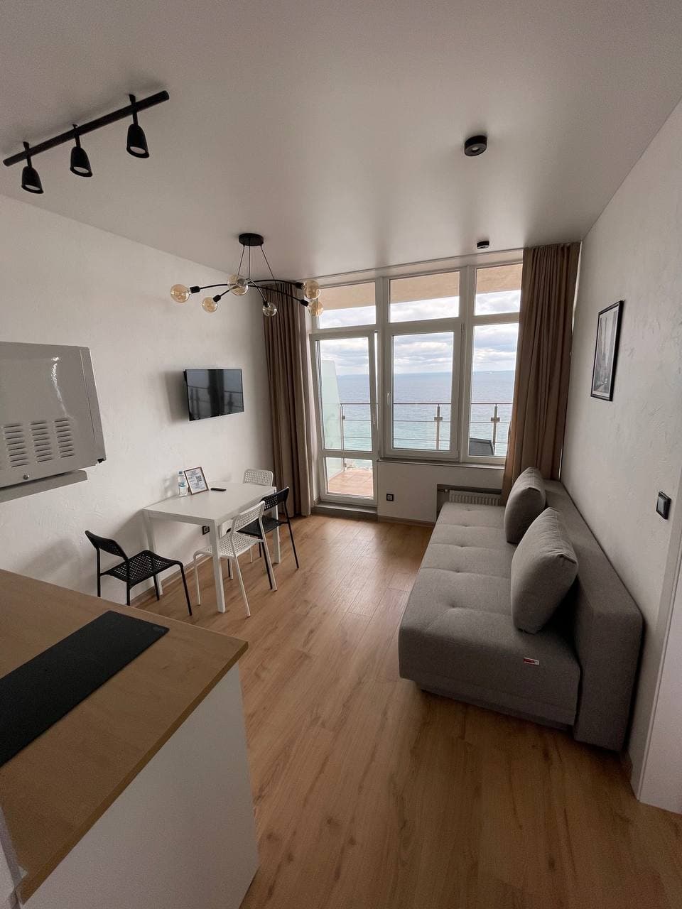 Ofrece alojamiento con aire acondicionado y WiFi gratuita. Puedes relajarte en la acogedora terraza disfrutando de las vistas al mar El apartamento cuenta con una cocina totalmente equipada con microondas, zona de estar, TV de pantalla plana, baño privado con lavadora y secador de pelo. Hay nevera, fogones y hervidor de agua. Un lugar para dormir: una cama de matrimonio y un sofá. En el territorio del complejo hay una tienda, farmacia, cafetería y otros servicios, hay un gran supermercado cerca
