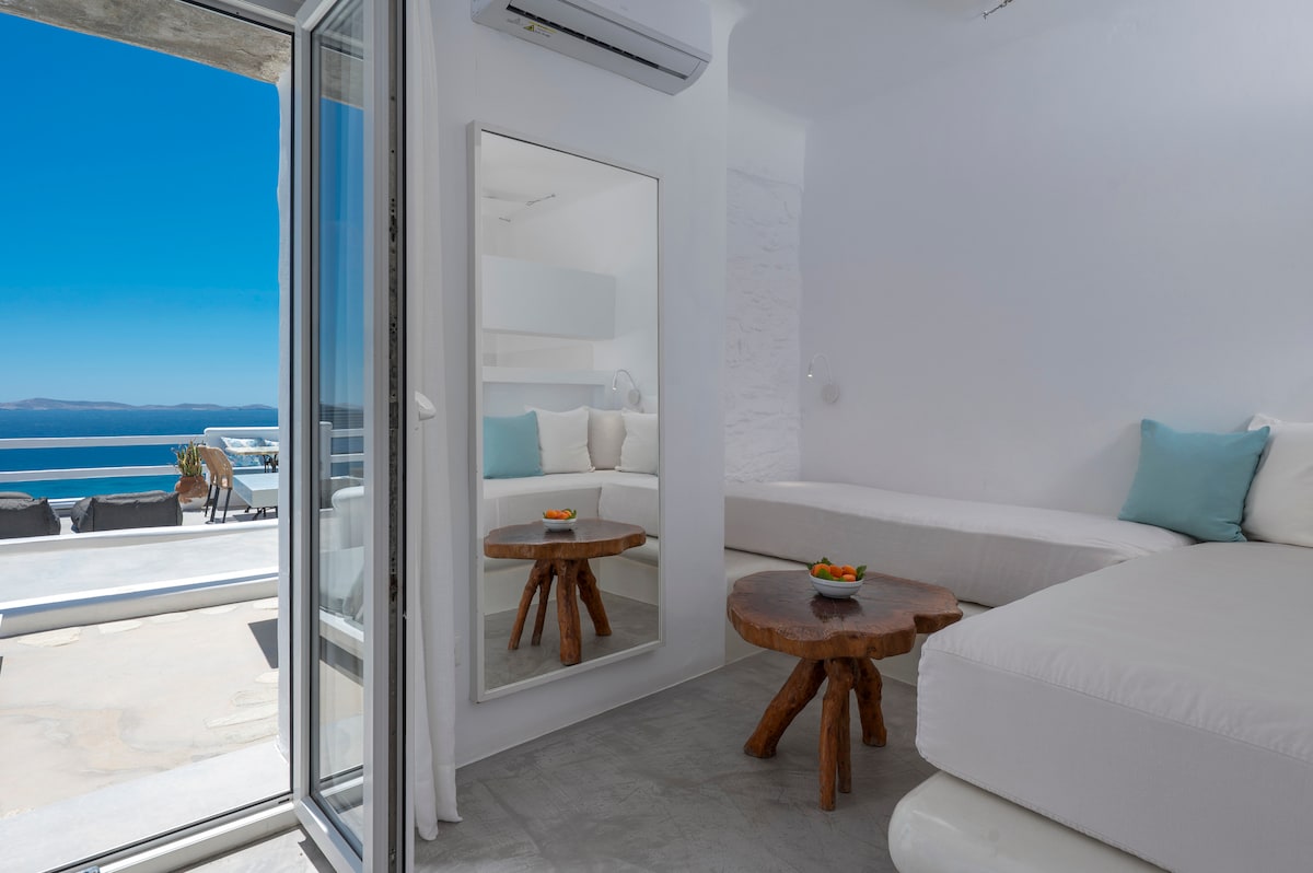 La suite se encuentra en la parte superior del complejo con impresionantes vistas panorámicas ininterrumpidas de Delos,Naxos,Paros y el Egeo. Su ubicación aislada ofrece a sus huéspedes privacidad ilimitada. El área interior se mide en 25 metros cuadrados, mientras que las puertas exteriores son de 90 metros cuadrados. Desde la cama doble y la piscina privada, puedes observar las impresionantes vistas. Además de la suite hay un baño privado con ducha y todas las comodidades necesarias para que pases una estancia maravillosa.