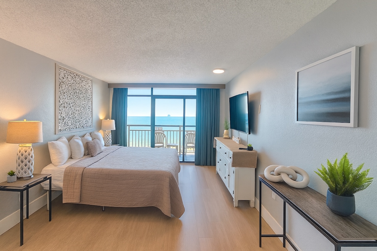 Disfruta de una estancia relajante y rejuvenecedora en este condominio frente al mar totalmente renovado. Disfruta de acabados modernos que incluyen encimeras de cuarzo, gabinetes de agitación, electrodomésticos de acero inoxidable, baño actualizado y muebles elegantes en todas partes. Esta unidad final del noveno piso ofrece impresionantes amaneceres, piscinas climatizadas cubiertas y al aire libre y jacuzzis, y un gran césped frente al mar con muchos asientos. Camina a restaurantes, cafeterías, bares y atracciones populares de MB, como el paseo marítimo, Sky Wheel, el centro de convenciones y CCMF.