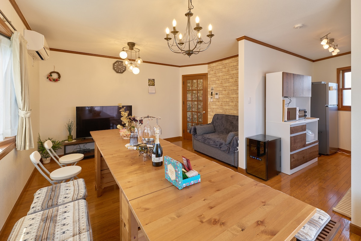 Crea recuerdos con este alojamiento único para familias. En un día despejado, la vista de Satoyama desde el jardín es muy hermosa. Todas las habitaciones tienen la visión del mundo de Ghibli El popular parque Ghibli está muy cerca (10 minutos en bicicleta, 30 minutos a pie). Todo el edificio es privado Se admiten perros pequeños (hasta 6 kg). Se admiten hasta 2 mascotas en el gran jardín de césped. Tiene capacidad para un grupo grande (hasta 11 personas) Aire acondicionado en la sala de estar y el dormitorio en todas las habitaciones Televisión con monitor grande (60 pulgadas) Amplia cocina completa Totalmente equipado con un área de barbacoa con jardín cubierto (se requiere reservación) Hay una parrilla de barbacoa ColeManga.La tarifa de uso es de 5000 yenes Estacionamiento gratuito hasta para tres autos en el lugar WiFi rápido está disponible. Ofrecemos 9 bicicletas eléctricas (1000 yenes por día, compartimos 2 casas, por lo que necesitas hacer una reservación) Disponemos de tenis de mesa.Es una verdadera mesa de tenis de mesa (de forma gratuita) - Instalación · Aire acondicionado en todas las habitaciones · Refrigerador · Secadora de gas · Lavadora · Microondas · Lavadora · Arrocera · Hervidor eléctrico · Secador de pelo · Estufa de casete en el horno caliente · Vasos · Platos · Aspiradora inalámbrica
