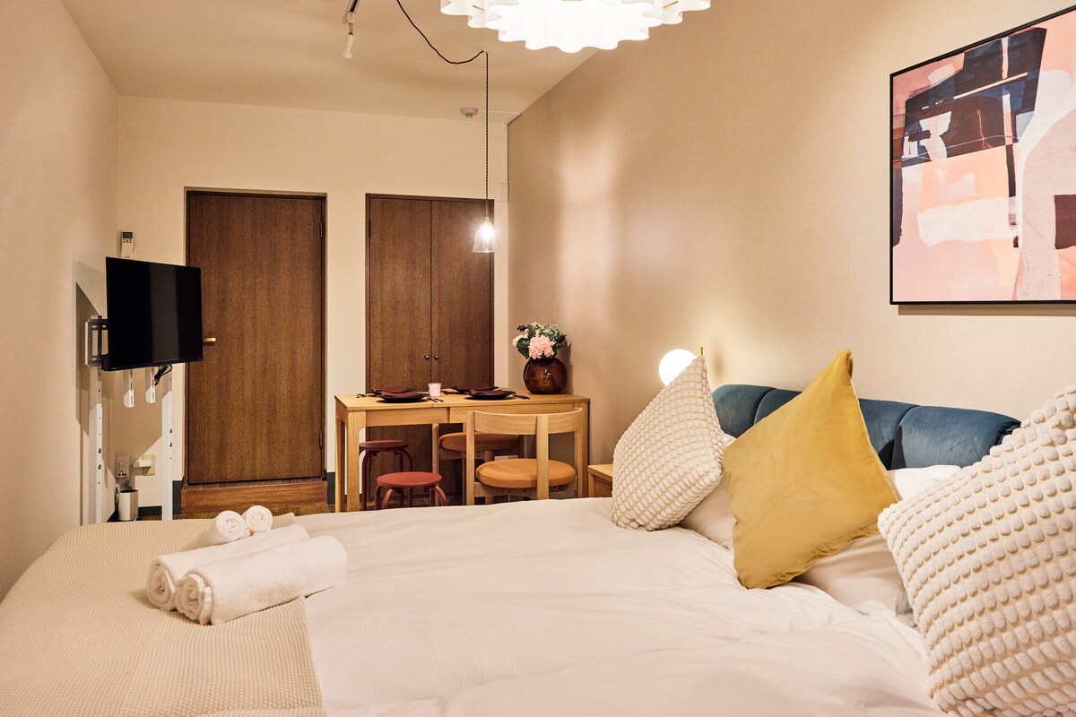A solo 5 minutos de la estación de Nakano-Shimbashi (línea Marunouchi), este apartamento de 27 ㎡ 1K está a solo 2 paradas de Shinjuku, pero está ubicado en una zona residencial tranquila. Cuenta con pisos de estilo de madera, iluminación suave y ventanas orientadas al sur con mucha luz solar. Dos camas semidobles con capacidad para 4 personas. Los tonos suaves de rosa y verde crean una sensación acogedora. Incluye una cocina compacta, nevera, microondas, Wi-Fi de alta velocidad y TV inteligente, ideal para parejas, amigos o familias pequeñas.