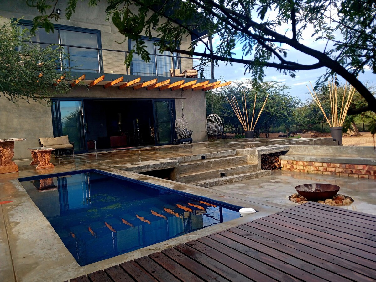 TU ESTANCIA MÁS AVENTURERA en Namibia está aquí... Ven y descubre un lugar único en Namibia. A solo 15 minutos en coche de Tsumeb y a una hora del Parque Nacional de Etosha. Disfruta del silencio de los alrededores de arbustos vírgenes, hermosas vistas a las montañas y una increíble observación de aves. Dormirás en una lujosa tienda de campaña fuera de lo común, con piscina privada y un espacioso baño en suite. La tienda de lujo está decorada con buen gusto y también es ecológica; todos los electrodomésticos funcionan con energía solar.