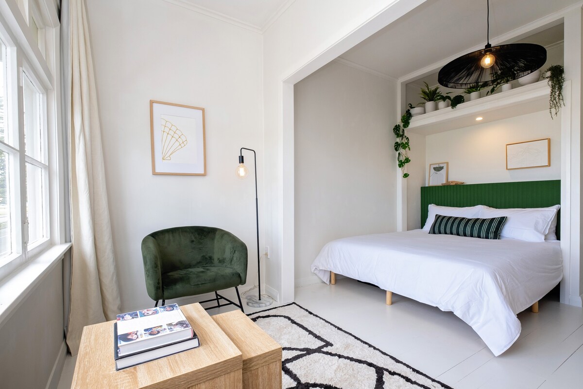 ¡Hola! Con hermosos textiles, muebles y arte, este tranquilo y soleado apartamento de un dormitorio en Bluff Hill ha sido recientemente renovado y es perfecto para tu fin de semana en Napier. Tiene aire acondicionado para mantenerte caliente y fresco y ¡el desayuno está incluido! Ten en cuenta que el apartamento no tiene televisión y tiene una pequeña cocina, no una cocina completa. También se llega al apartamento bajando 30 escalones desde la calle. Estás a 10 minutos a pie de las cafeterías, restaurantes y bares que Napier y Ahuriri tienen en abundancia.
