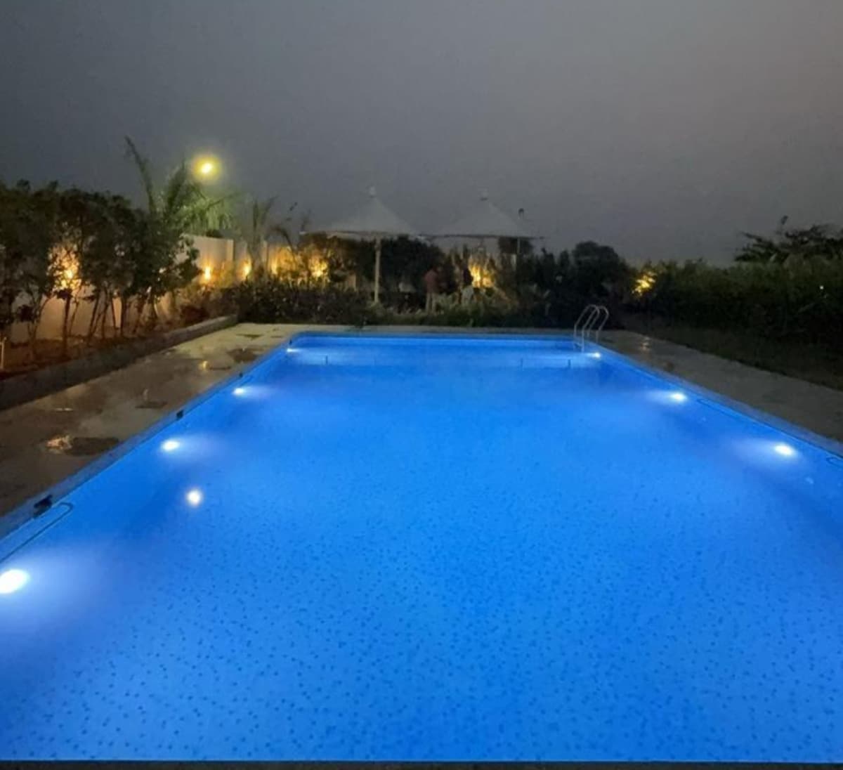 Forget your worries in this spacious and serene space.Relax, party, and unwind at this luxury 4BHK farmhouse. Comfortably sleeps 14 guests with 8 extra beds available. Enjoy a private swimming pool with in-pool seating and bar counter, sauna, BBQ area, outdoor shower, bonfire, and a large green lawn. Ample parking for 15 cars. Perfect for staycations, celebrations, and events