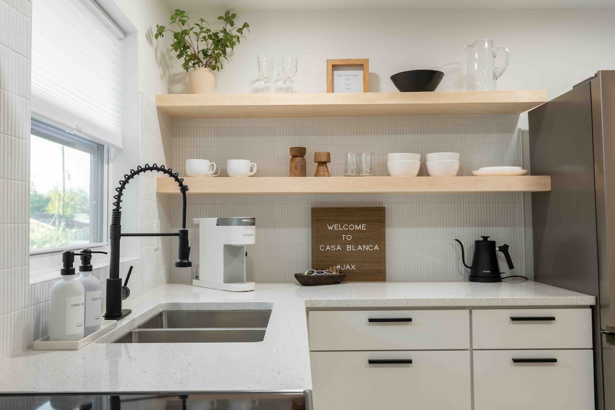 ¡Bienvenido a Happy's Hideaway, una casa de carruajes para familias que cumple todos los requisitos! Nuestro luminoso apartamento de 2 dormitorios está cerca del centro de la ciudad y a 12 millas de JIA. Ubicado en una calle tranquila entre robles maduros con una piscina de agua salada, está a solo 15 millas de Atlantic Beach (a 22-28 minutos en coche). Estamos justo al lado de Main Street, donde podrás disfrutar de cerveza local, helado, café, pizza y lanzamiento de hachas. Esta unidad está en el segundo piso y solo se puede acceder a ella por las escaleras.