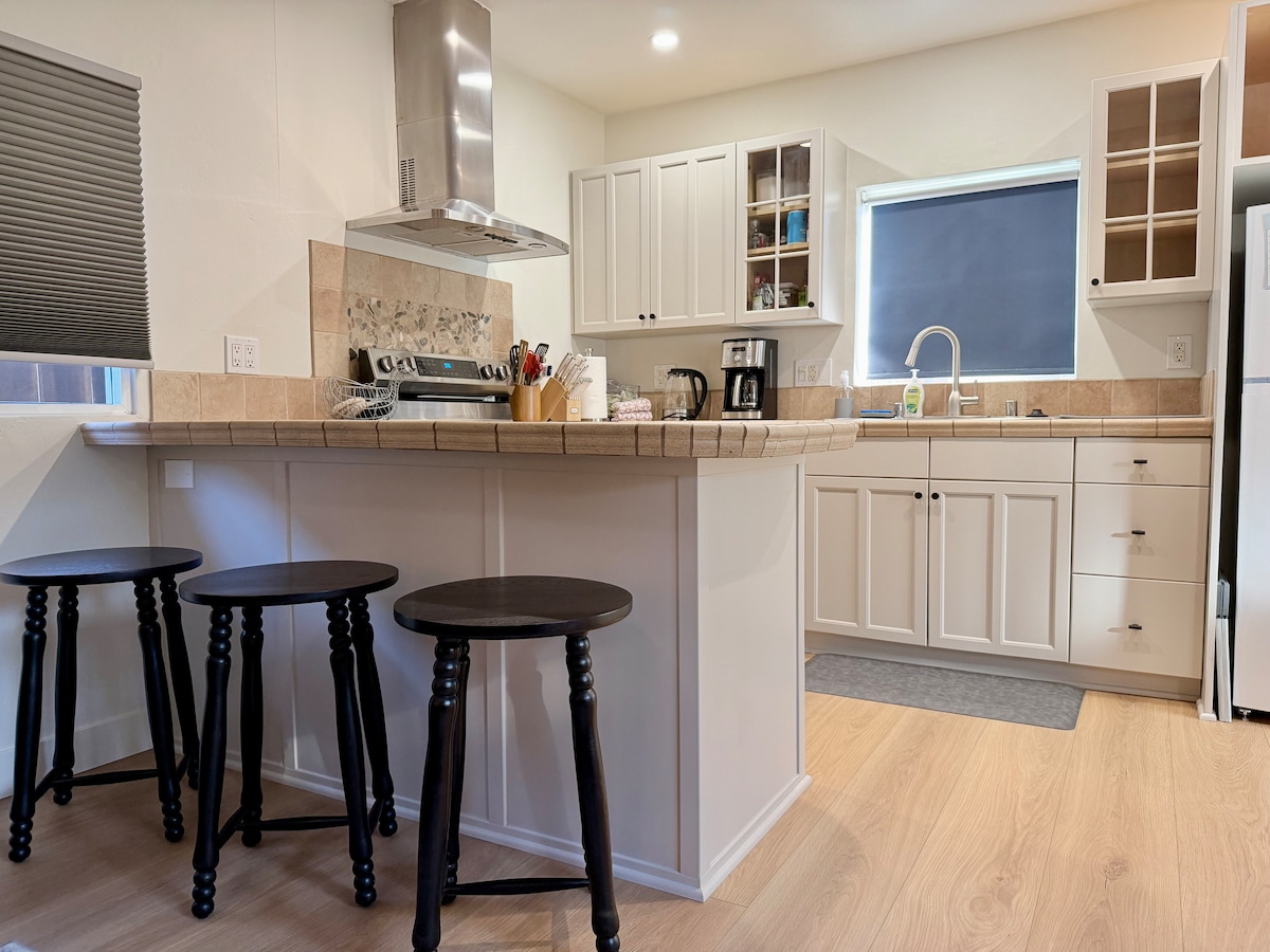 Siéntate en el patio trasero y luego entra para disfrutar de las vistas frondosas desde una sala de estar con triple orientación. El apartamento tiene un ambiente de casa de campo con jardineras y accesorios de madera. Una planta colgante y sábanas blancas proporcionan una sensación de calma. Despiértate con el canto de los pájaros y explora nuestro 1/2 acre de árboles frutales, huertos y paisajes. Sin embargo, la mayoría de las atracciones de San Diego están a solo 5 a 10 millas de distancia. La nueva cocina está incluida en tu espacio para que puedas preparar tus propias comidas si lo deseas. El equipo de cocina incluye un horno tostador de convección, cafetera, olla caliente, microondas y placa de inducción, ollas y sartenes, utensilios de cocina, cubiertos y platos. También ofrecemos café, té, azúcar, sal y pimienta, aceite para cocinar y hielo. Este espacio está unido a nuestra casa principal, pero tendrás tu propia entrada independiente y cocina privada/ sala de estar, cama y baño. Nos encantaría saludarte y mostrarte los alrededores cuando llegues, pero si no podemos, tendrás tu propio código de puerta único para entrar. Hemos preparado una carpeta de información para los huéspedes y podemos ayudarte a planificar el mejor uso de tu tiempo. Sin embargo, si prefieres estar solo, también nos parece bien. Hemos caminado hasta el centro de la ciudad o hasta el tranvía más cercano, pero a menos que seas un caminante y salgas a hacer ejercicio, probablemente querrás un coche. Ahora hay muchas bicicletas disponibles para alquilar, pero será cuesta arriba para volver a la casa. Algunos de nuestros huéspedes han optado por depender solo de Uber, en cuyo caso la entrega de comestibles y/o comidas es útil. Si tienes un vuelo por la tarde o por la noche, puedes guardar el equipaje en nuestra casa después de la salida a las 10:00 a. m. Estamos en una zona residencial montañosa con tiendas, restaurantes y acceso a autobuses/tranvías a unas 2 millas de distancia, por lo que tendrás la mayor flexibilidad si vienes en coche. Si eliges Uber, puedes pedir comestibles o comidas para llevar.