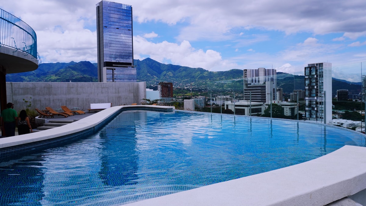 Best location in San Jose! High Speed internet! Free parking, pool and gym! Social areas and co working are available with previous reservation. Close to the National Stadium, Airport, San José downtown, Multiplaza shopping center, restaurants and Escazú. Walking distance from la Sabana park with all the commodities for a long stay: smart TV, comfy bed, AC, balcony, pool, gym, coworking, meeting room, Sky deck, BBQ area, cleaning station, full kitchen, and much more!