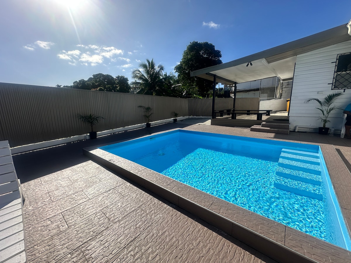 Bienvenido a Villa Belmoral, Suva, una villa nueva y elegante de 4 dormitorios (2 principales con baño) con piscina privada, a solo 8 minutos de la ciudad de Suva. Disfruta de una vida moderna, una cocina totalmente equipada, agua fría y caliente, lavandería, aire acondicionado en todas las habitaciones y sala de estar, ducha al aire libre, tanque de agua, circuito cerrado de televisión las 24 horas, los 7 días de la semana y WiFi gratuito. Todas las comodidades necesarias demostraron que pueden alojar de 8 a 10 huéspedes con camas flexibles. Perfecto para familias, grupos y estancias de negocios, con tiendas y cafés a 2 minutos. Tu escapada tropical te espera, ¡reserva ahora!