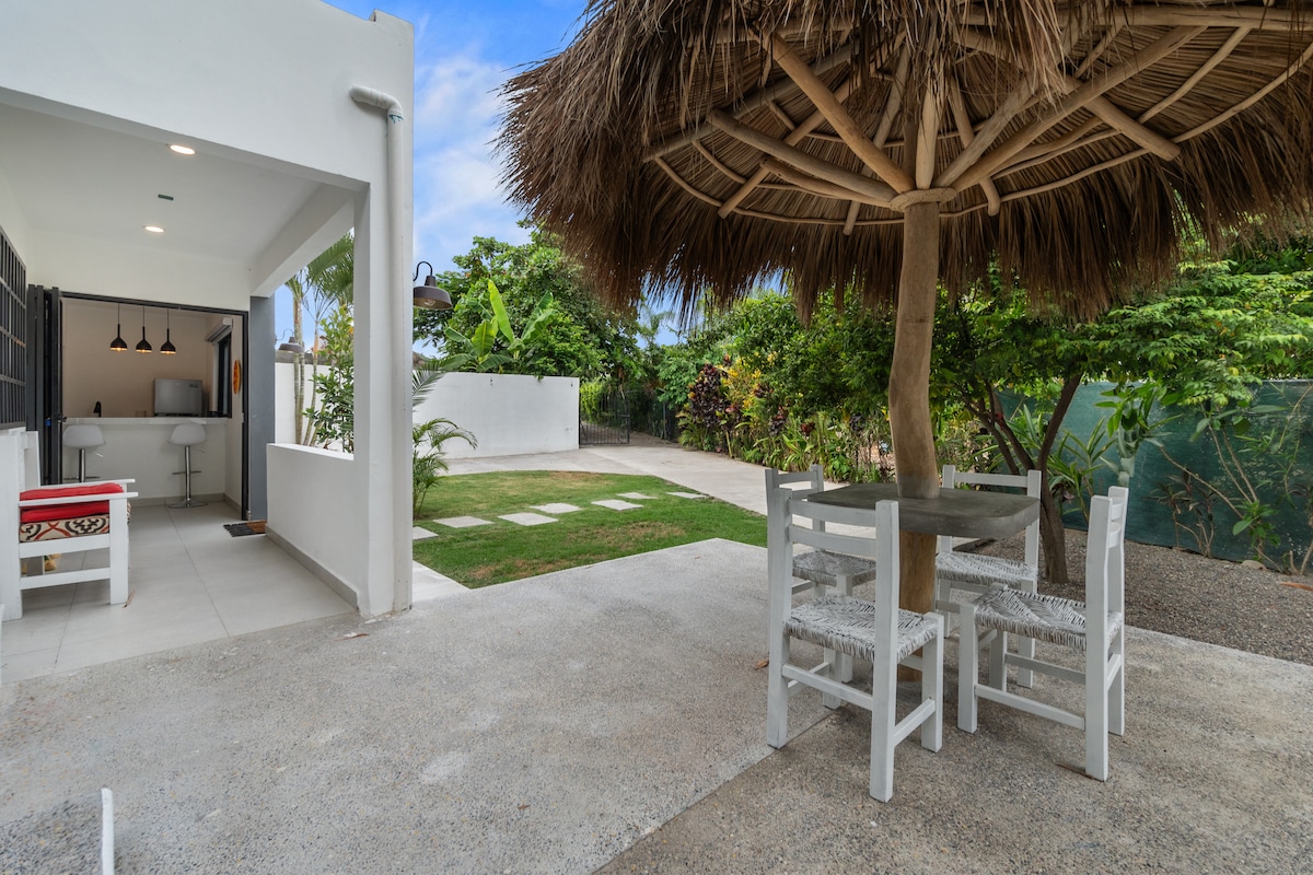 Sendero is a 2 bedroom casita with swimming pool access in a lovely tropical garden setting. Just a few blocks from San Pancho town center & 10 minute walk to the beach. Watch the sun set on the ocean from your private roof top deck. Fully-equipped kitchen that includes fridge, dishwasher, stove with oven, blender, microwave, toaster oven, coffee maker, & filtered water. Rooms are all fully screened w/ceiling fans. Guests have access to heated salt water pool. AC is available in the summer.